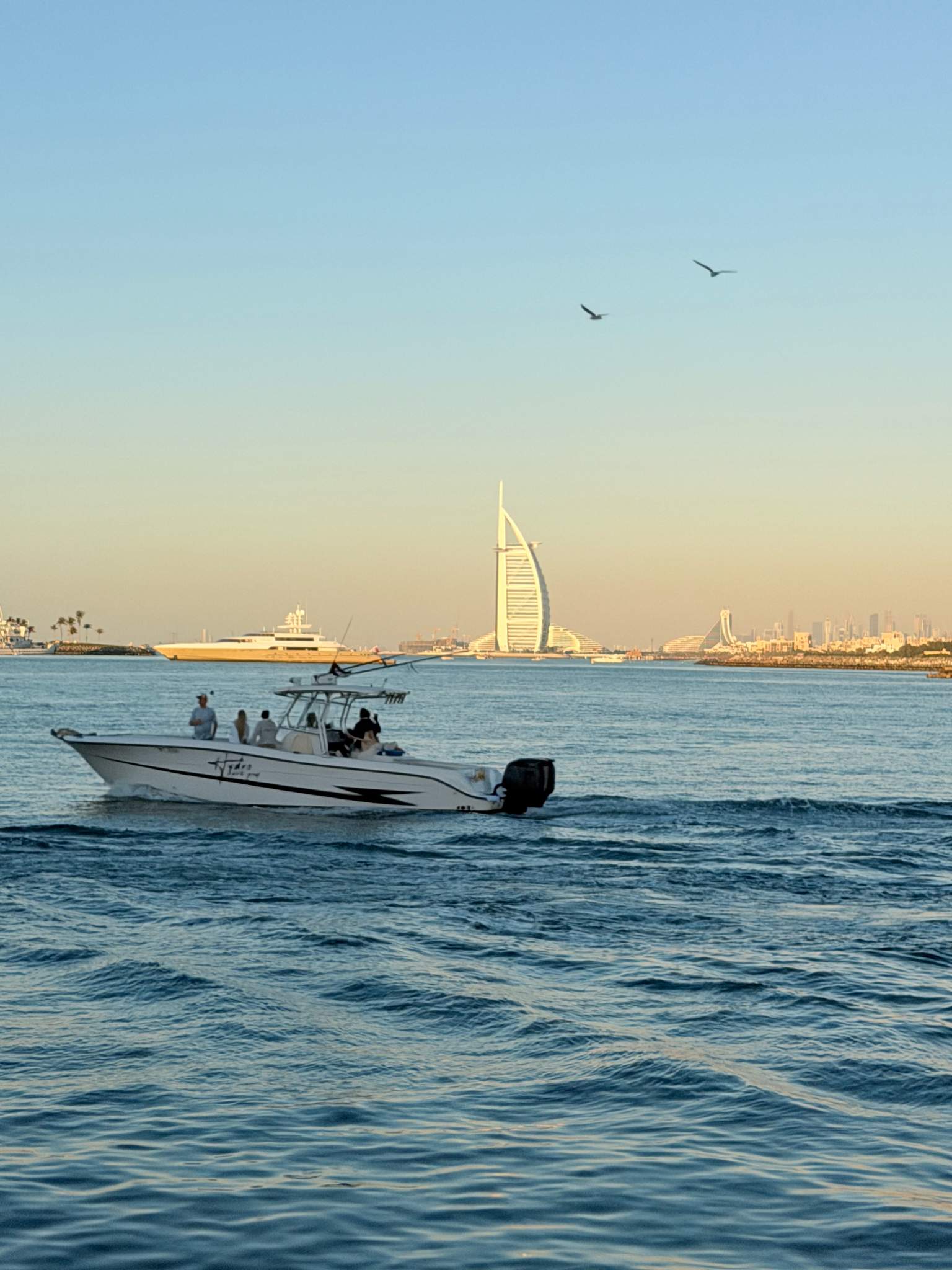Ao longe, surge no horizonte a silhueta em forma de vela do Burj Al Arab. Este último momento panorâmico é perfeito para fotografias e contemplação tranquila, oferecendo uma vista ampla e desimpedida de um dos marcos mais famosos da cidade antes de o cruzeiro regressar lentamente.