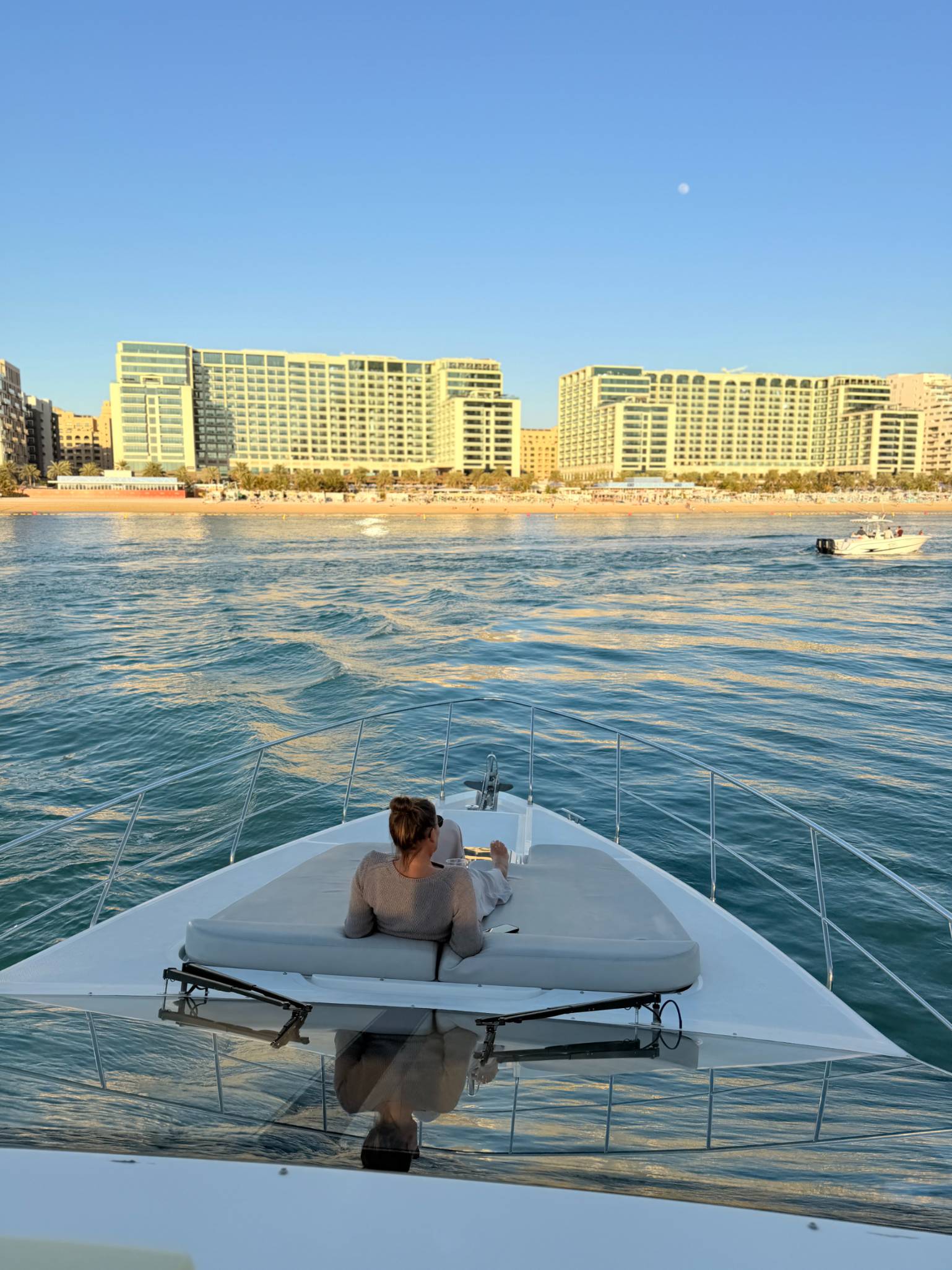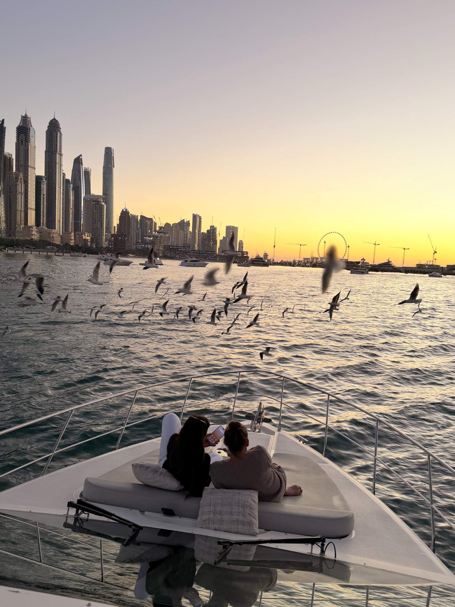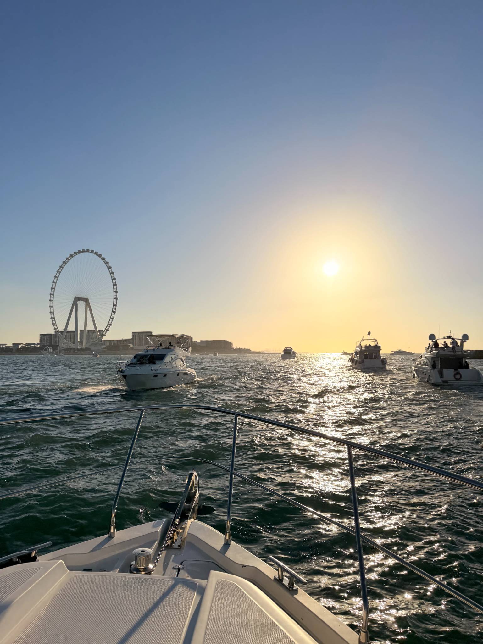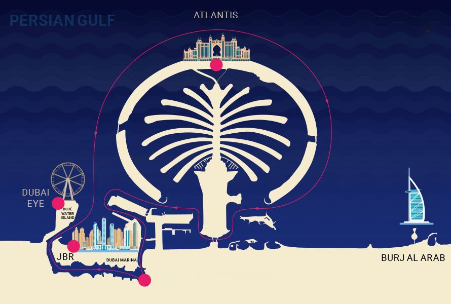 Ao aproximar-se da Bluewaters Island, a paisagem abre-se e a atmosfera torna-se mais leve e relaxante. No horizonte ergue-se o Dubai Ain, símbolo da opulência moderna da cidade. Este trecho da costa oferece vistas deslumbrantes e um momento perfeito para sentir a brisa do mar, tirar fotos ou simplesmente apreciar a elegância e a grandeza do Dubai a partir do iate.
